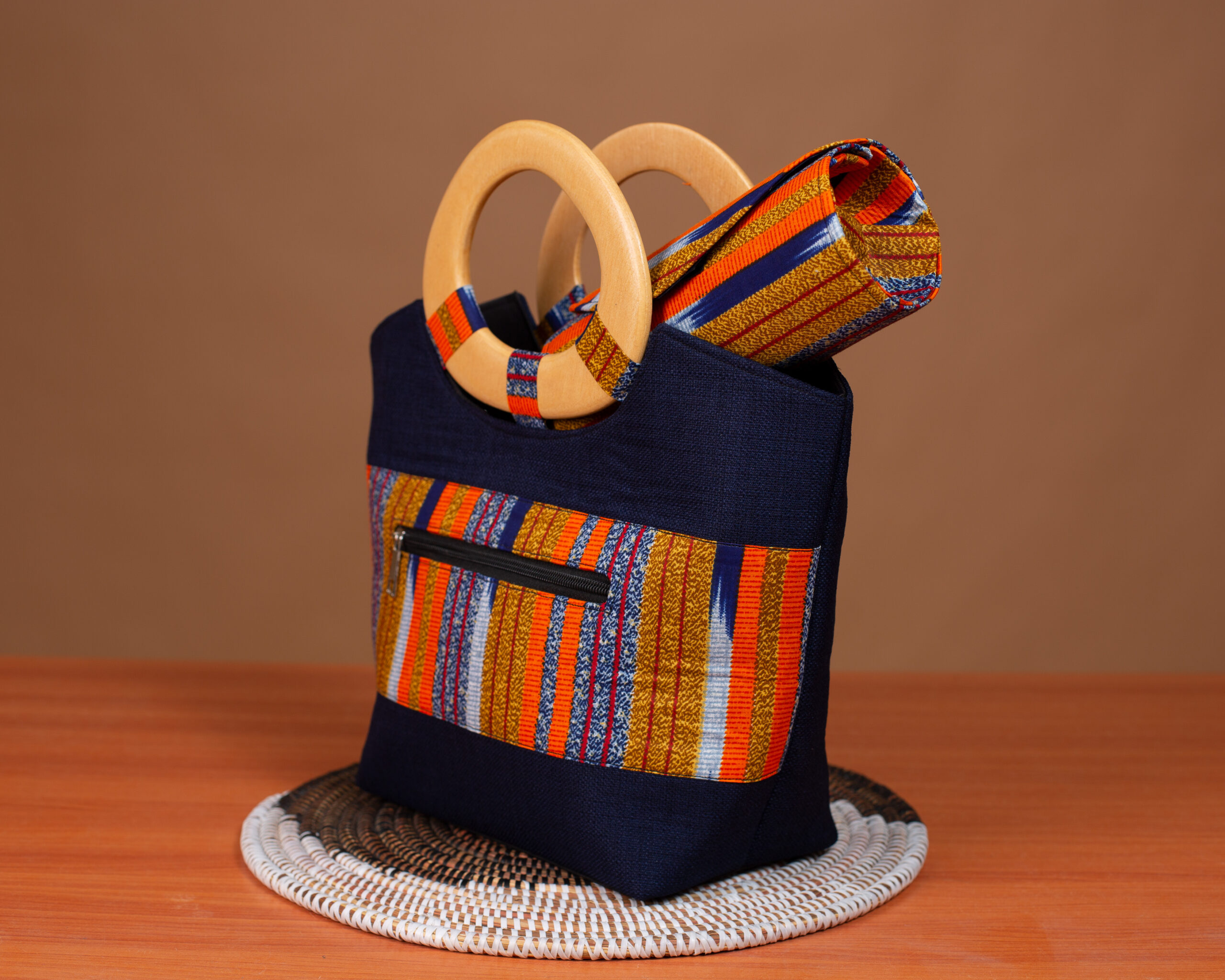 Sac Wax Femme Baoulé Bleu Nuit avec Poignée Bois et Portefeuille – Fait Main au Sénégal